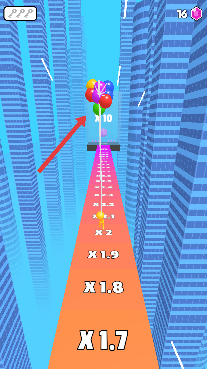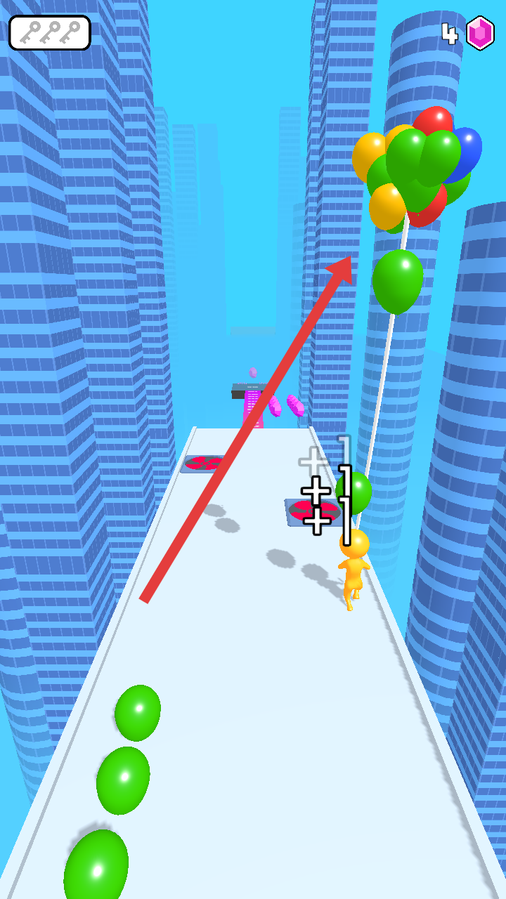 1、玩家操控游戲小人城市高樓間的跑道上奔跑,收集彩色氣球和鉆石等物品。
