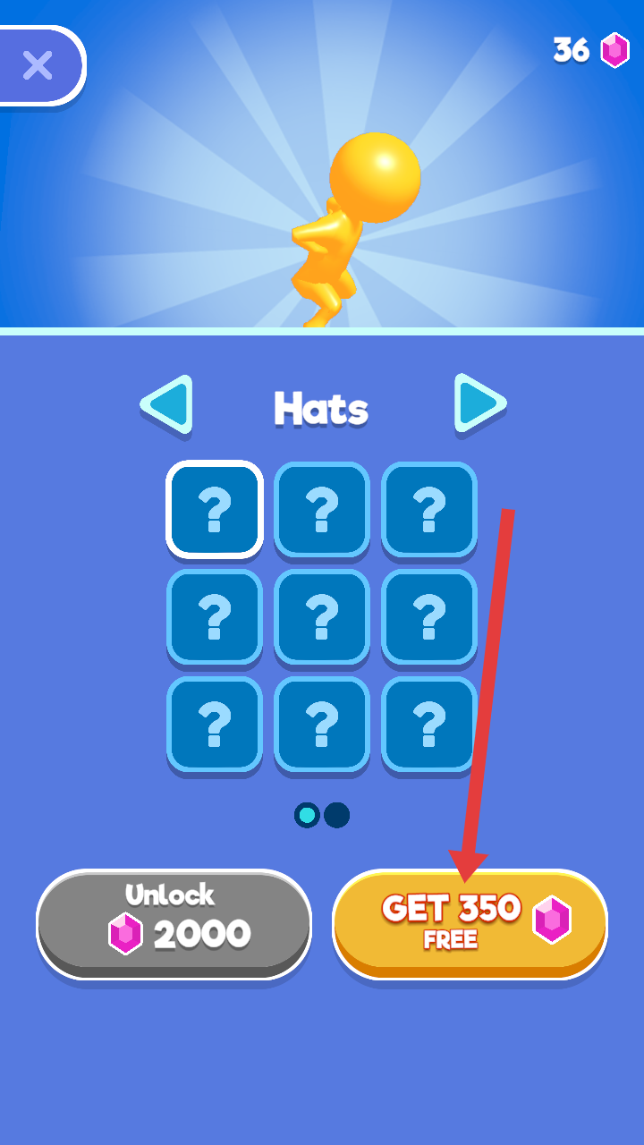 4、游戲的帽子Hats等裝扮解鎖界面,玩家可通過花費鉆石如2000顆鉆或獲取免費鉆石如350顆免費鉆來解鎖不同的帽子裝扮,豐富角色外觀。
