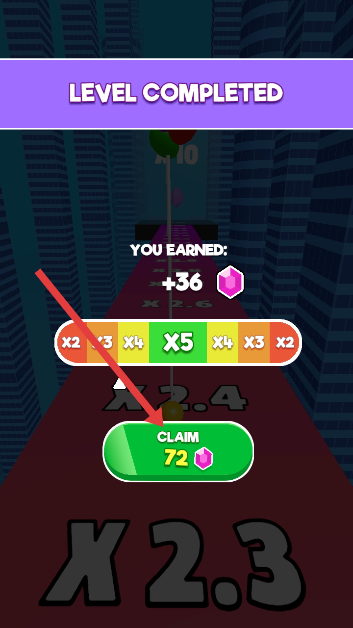 3、成功完成關卡后,會顯示LEVELCOMPLETED,玩家可點擊CLAIM按鈕領取鉆石獎勵如72顆鉆石。