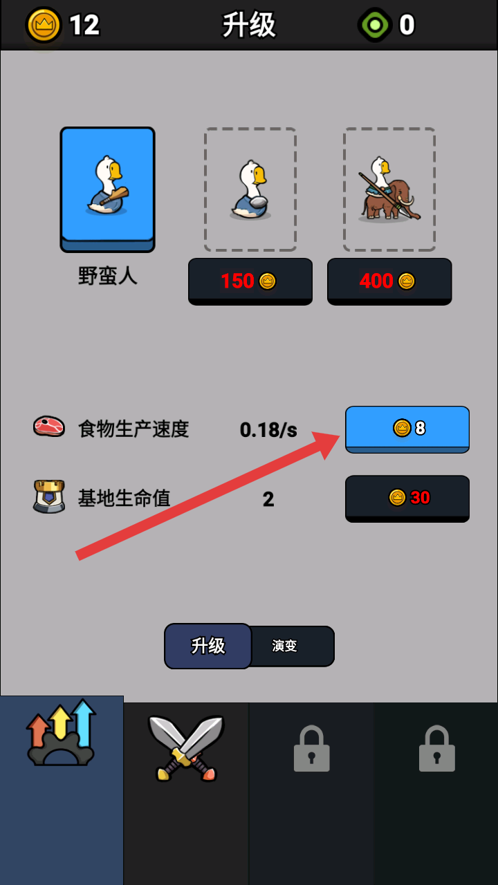 4、之后進(jìn)入升級(jí)界面,能使用獲得的金幣升級(jí)不同的戰(zhàn)斗單位,像野蠻人等,也可提升食物生產(chǎn)速度、基地生命值等屬性,增強(qiáng)戰(zhàn)力,為后續(xù)關(guān)卡做準(zhǔn)備。