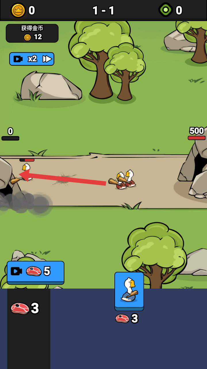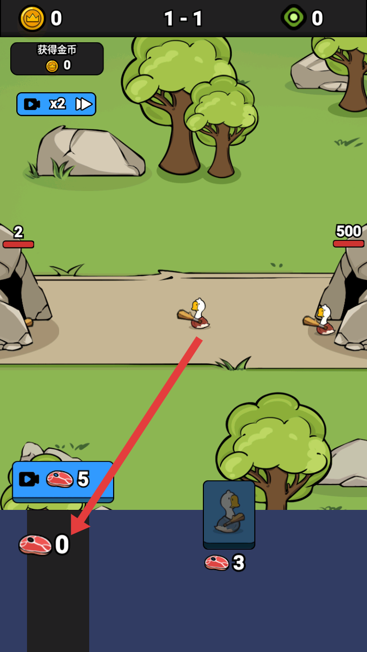 1、進(jìn)入游戲在關(guān)卡1,可看到有鴨子形象的角色,需消耗食物如肉塊來部署戰(zhàn)斗單位。