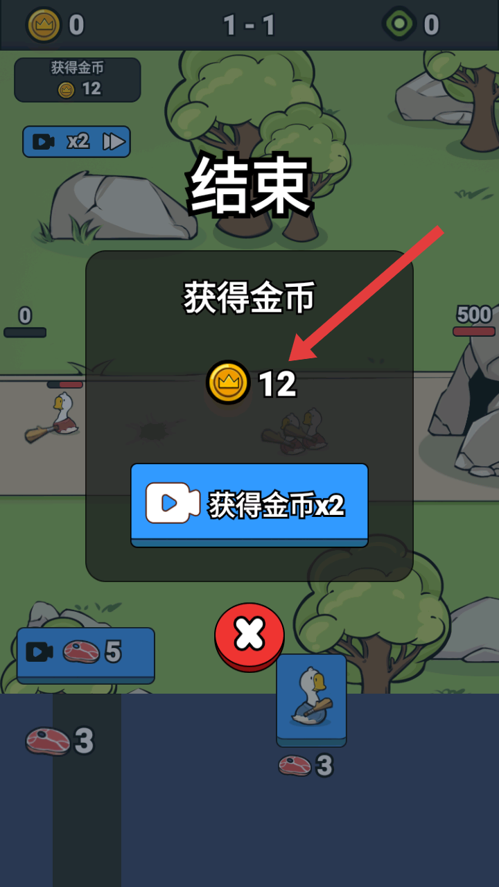 3、戰(zhàn)斗結(jié)束后,會(huì)結(jié)算獲得的金幣數(shù)量,還可選擇觀看廣告來翻倍金幣,按箭頭可進(jìn)入下一關(guān)的戰(zhàn)斗。