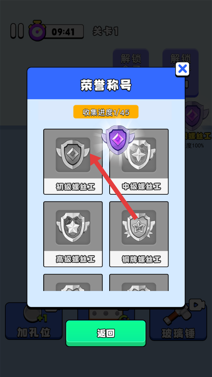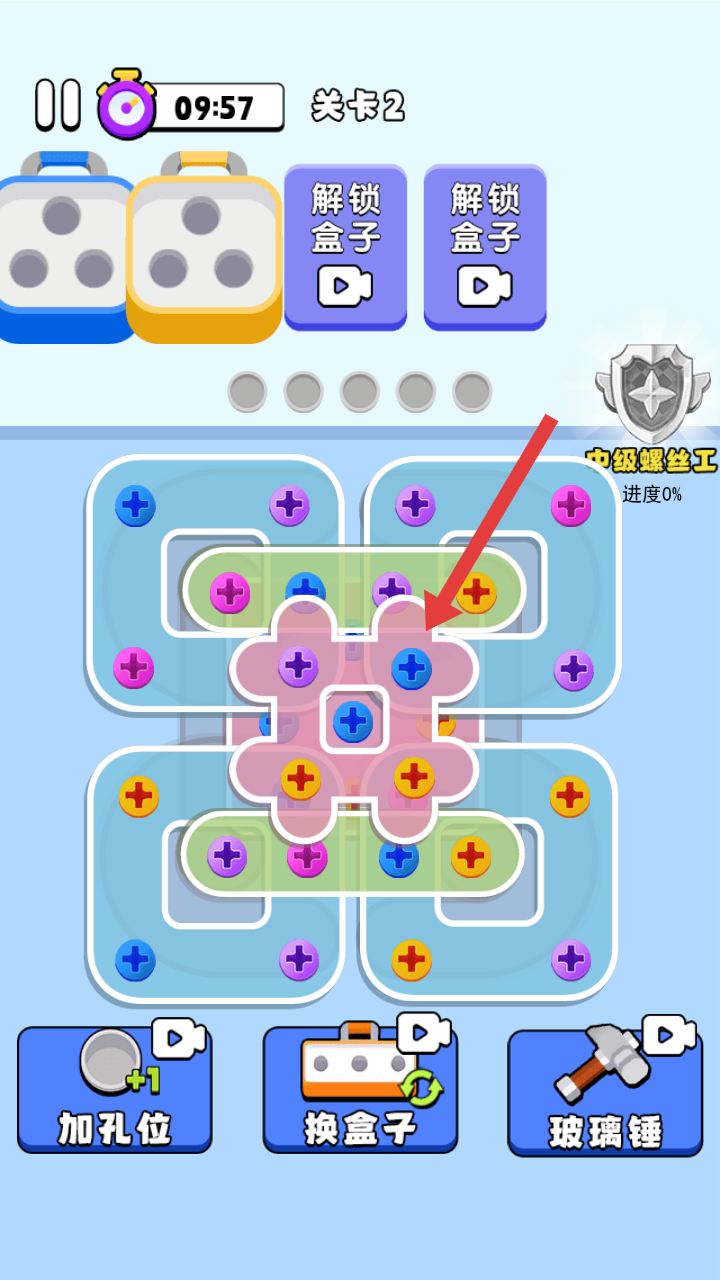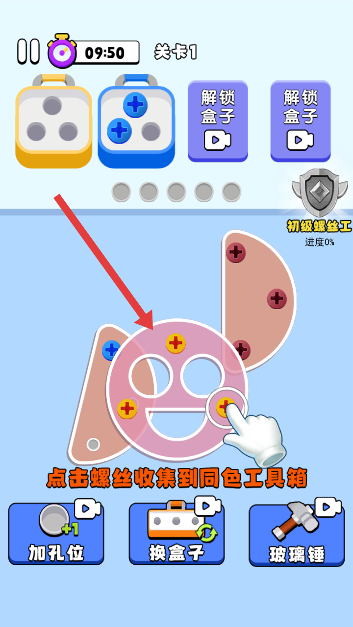 2、關卡里依據(jù)提示點擊螺絲,把螺絲收集到同色的工具箱中,右邊還能看到初級螺絲工徽章進度。