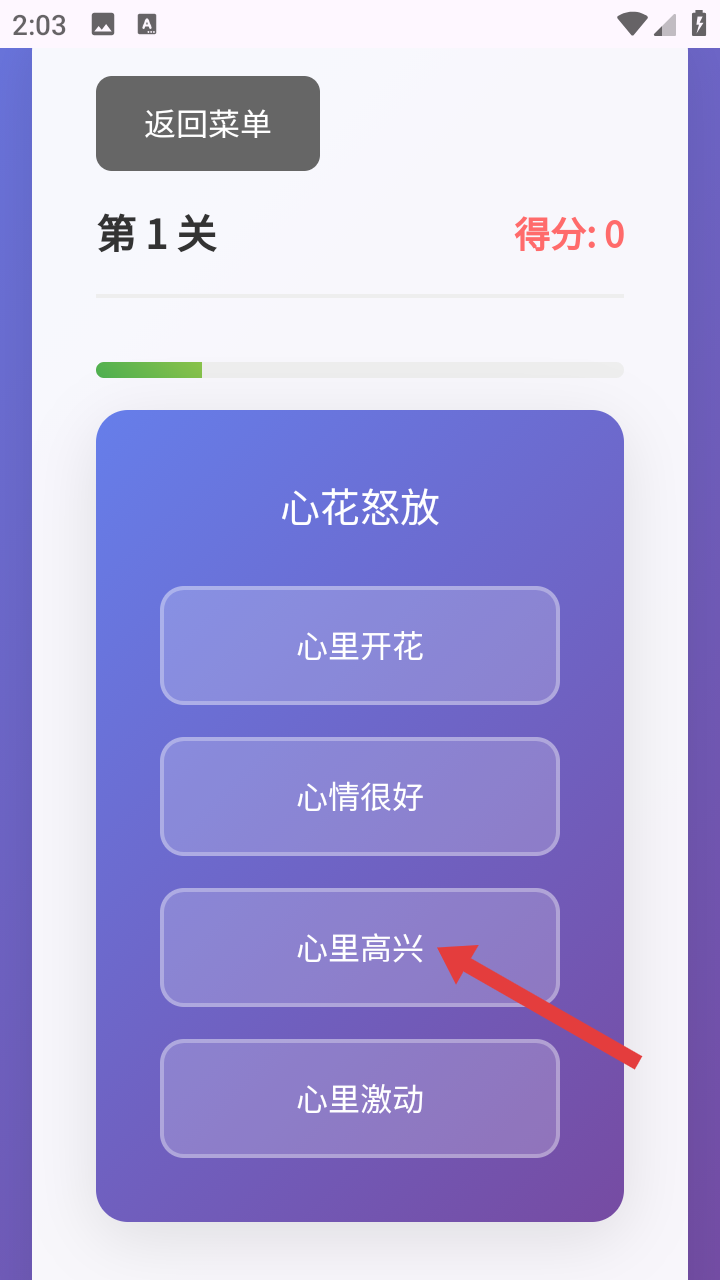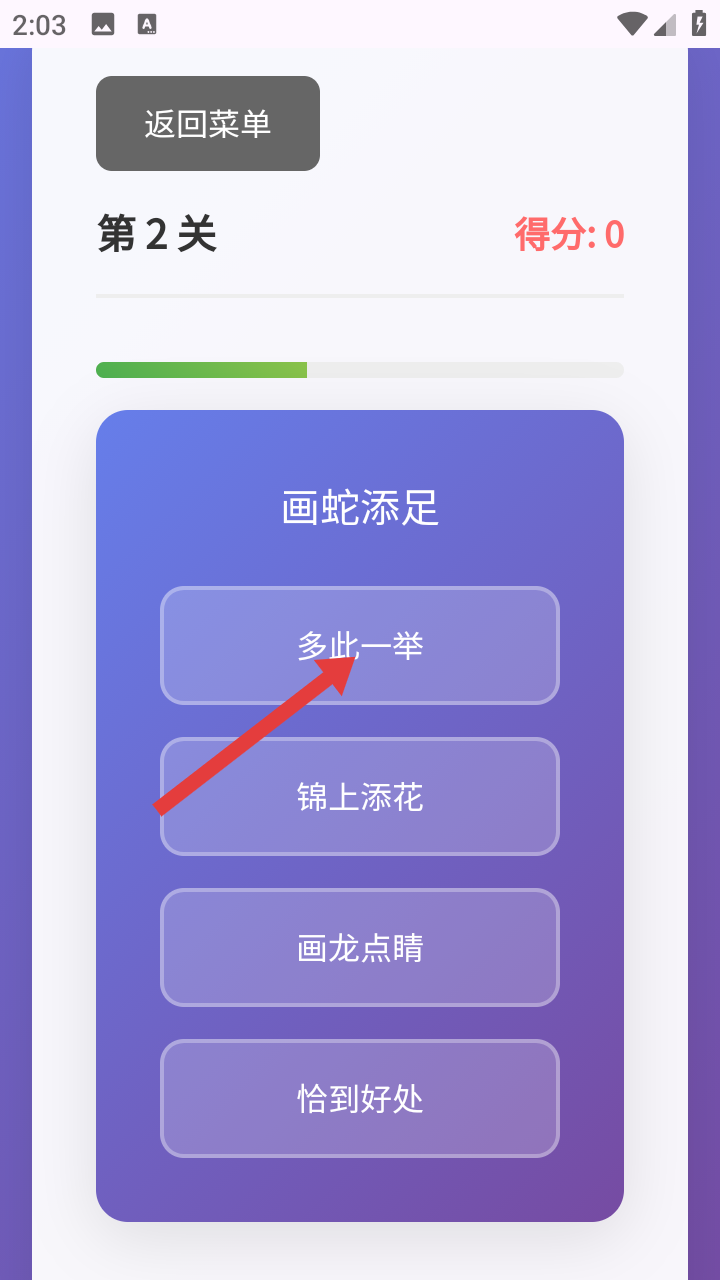 2、選好模式進(jìn)入關(guān)卡,屏幕會顯示成語,下方有幾個選項,需點擊認(rèn)為正確的選項來完成答題。