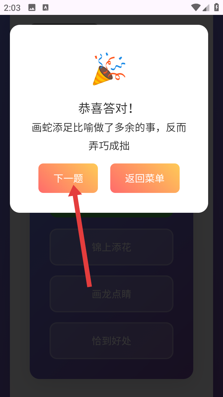 4、答對題目會彈出恭喜答對的提示框,還會有成語解釋,可點擊下一題繼續(xù)挑戰(zhàn),也能返回菜單重新選模式。