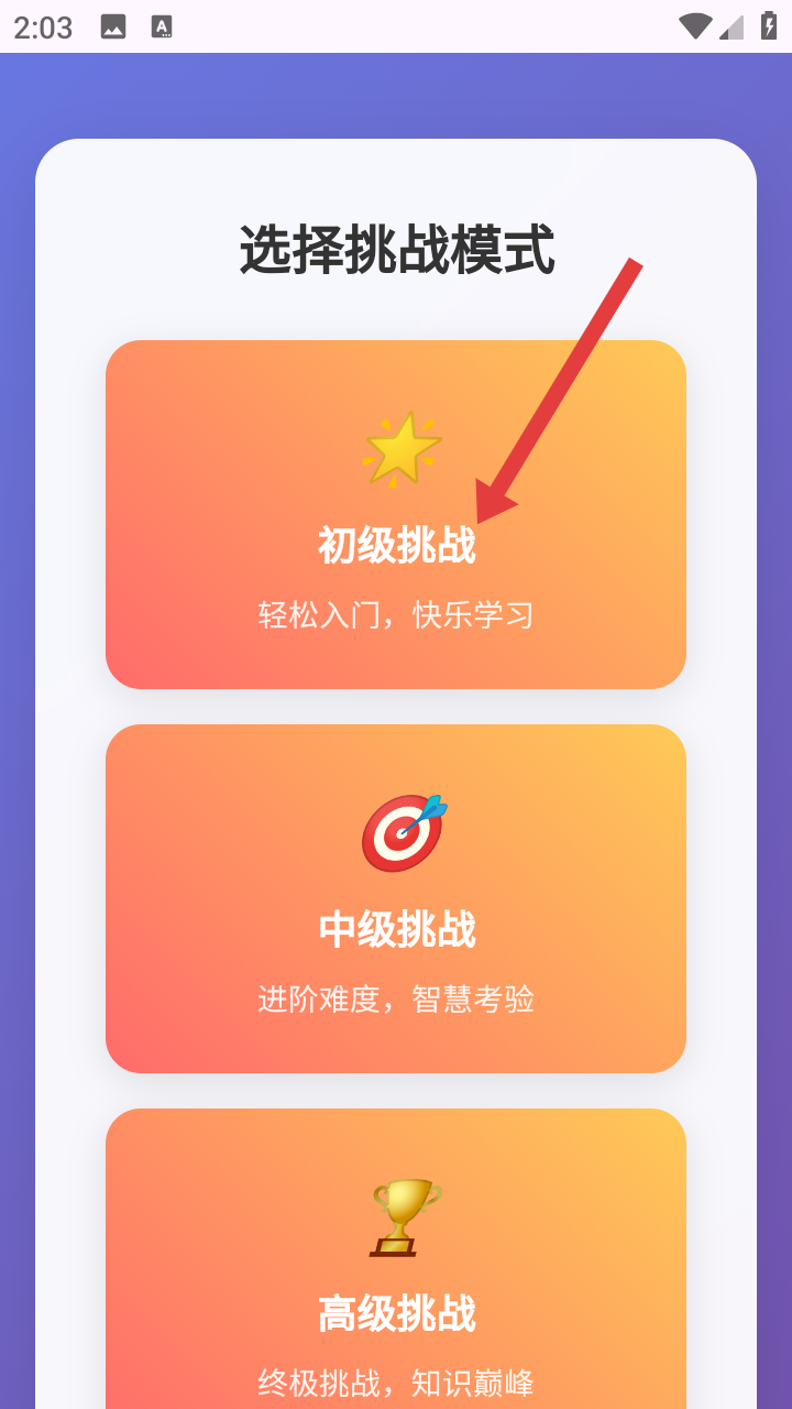 1、進(jìn)入游戲后可選擇初級挑戰(zhàn)、中級挑戰(zhàn)、高級挑戰(zhàn)中選擇模式,不同模式難度不同,能根據(jù)自身情況挑選。
