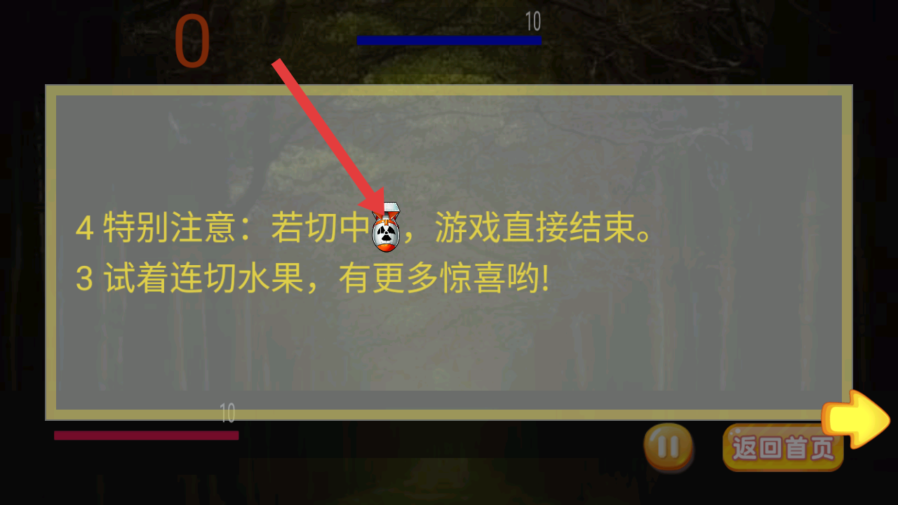 3、若切中帶有骷髏頭的特殊炸彈,游戲會直接結(jié)束,試著連切水果,會有更多驚喜。
