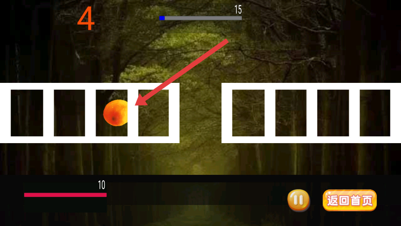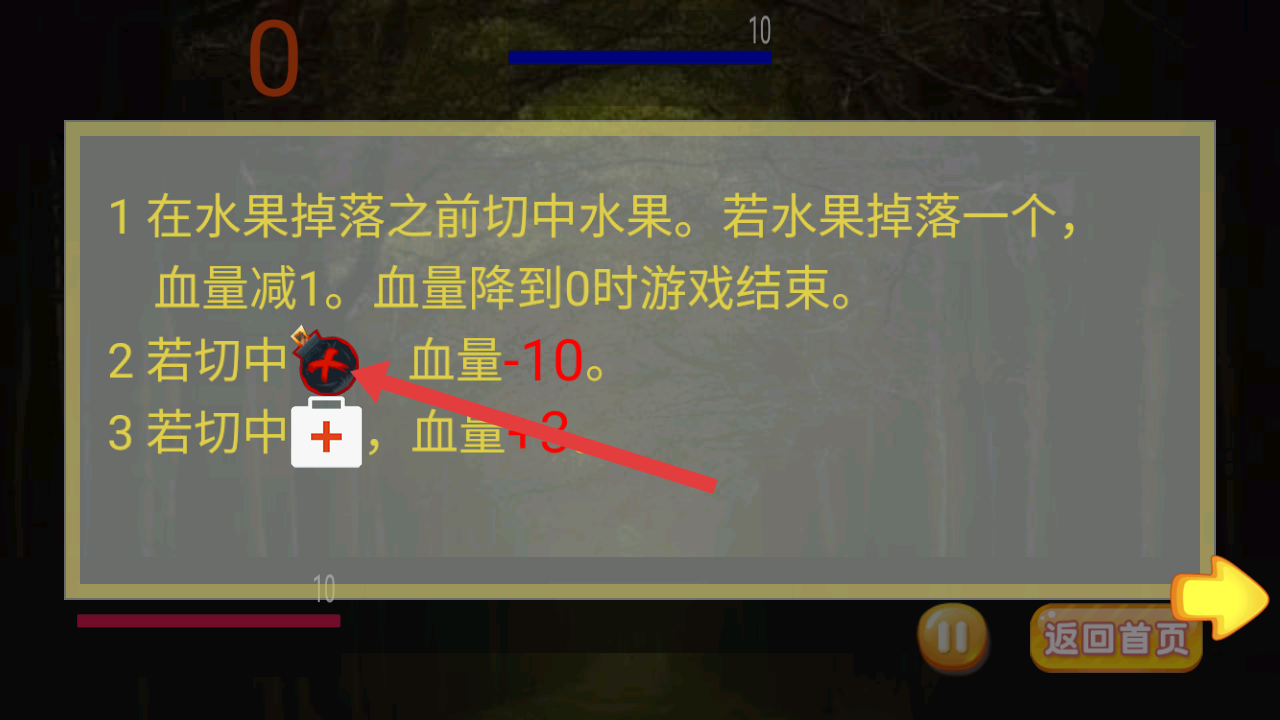 2、要讓水果掉落前切中水果,水果掉落一個血量減1,血量到0游戲結(jié)束,切中炸彈血量減10。