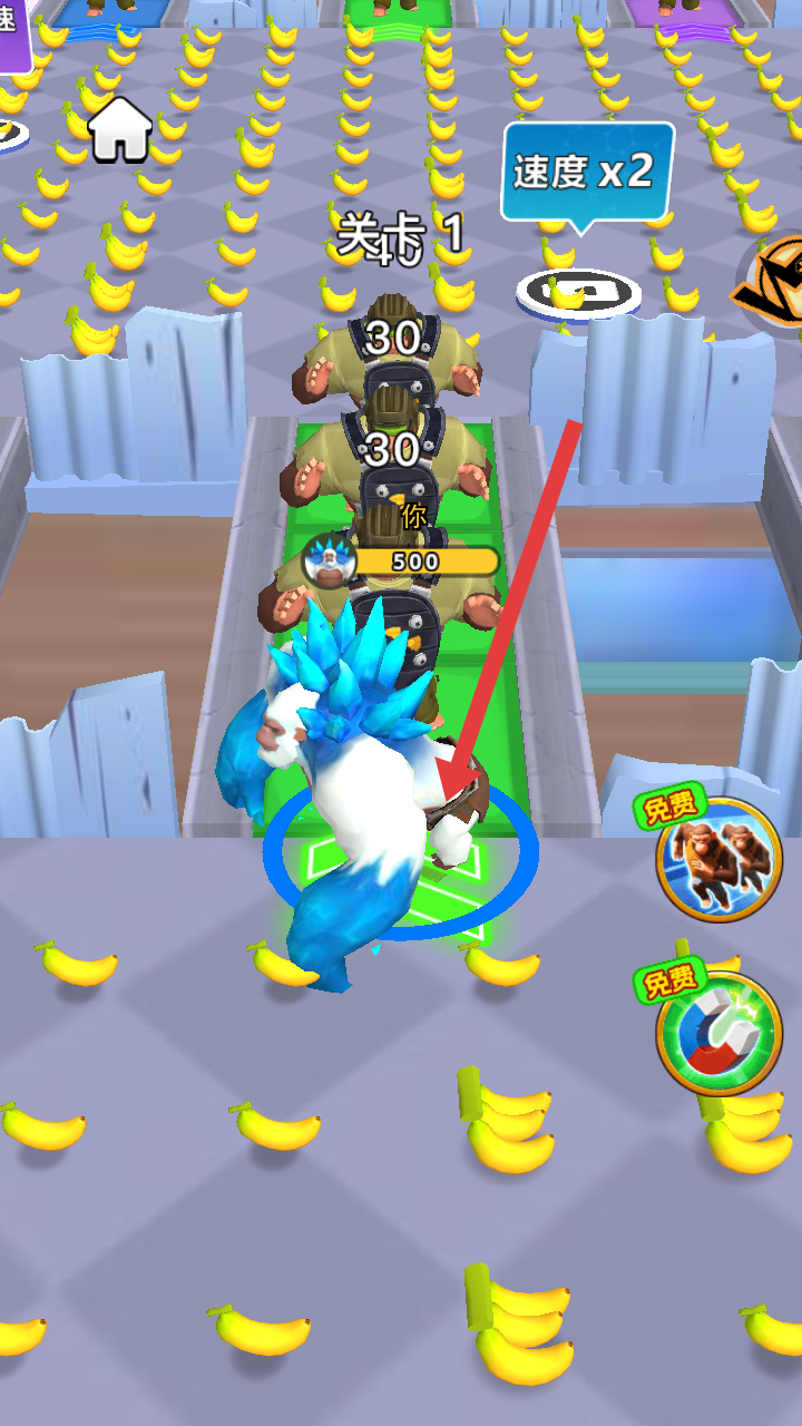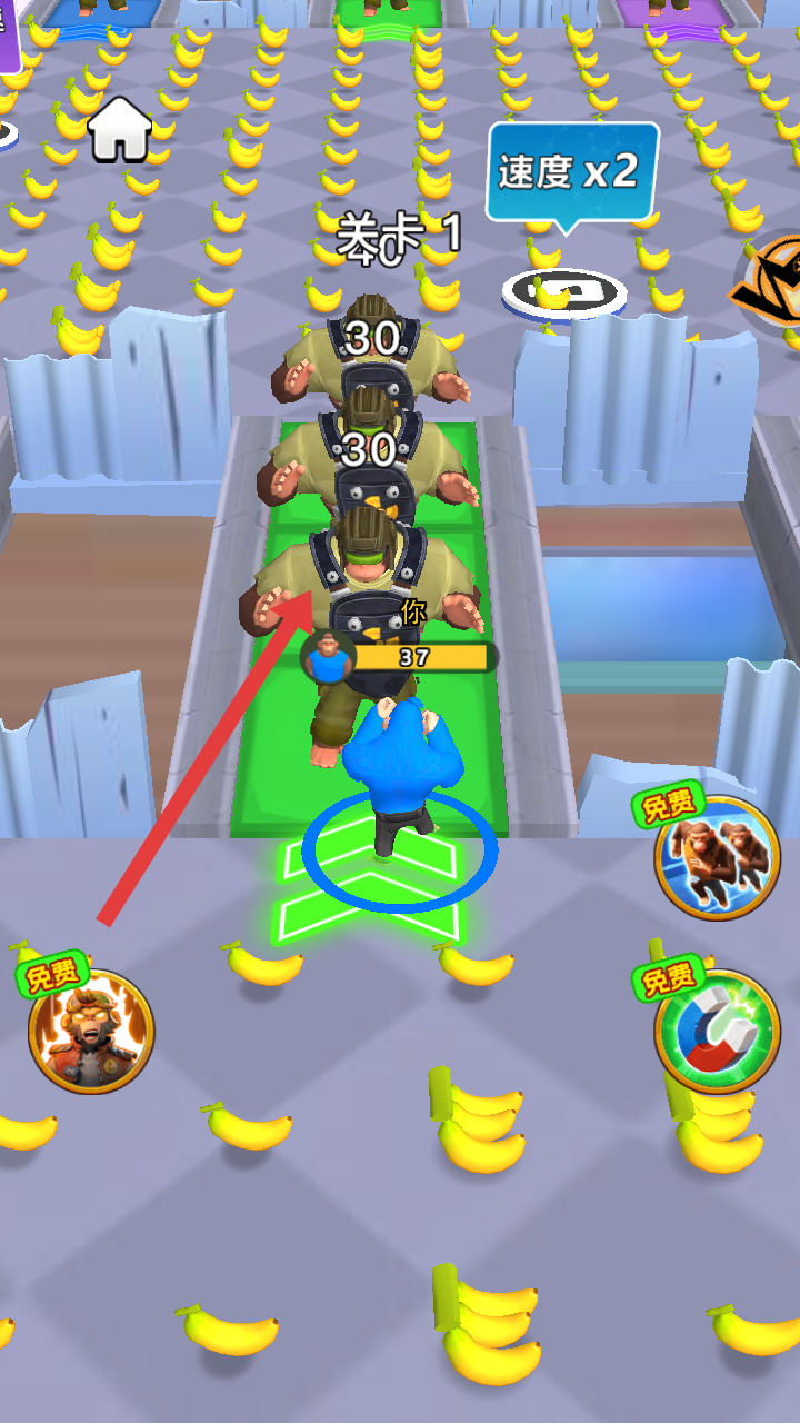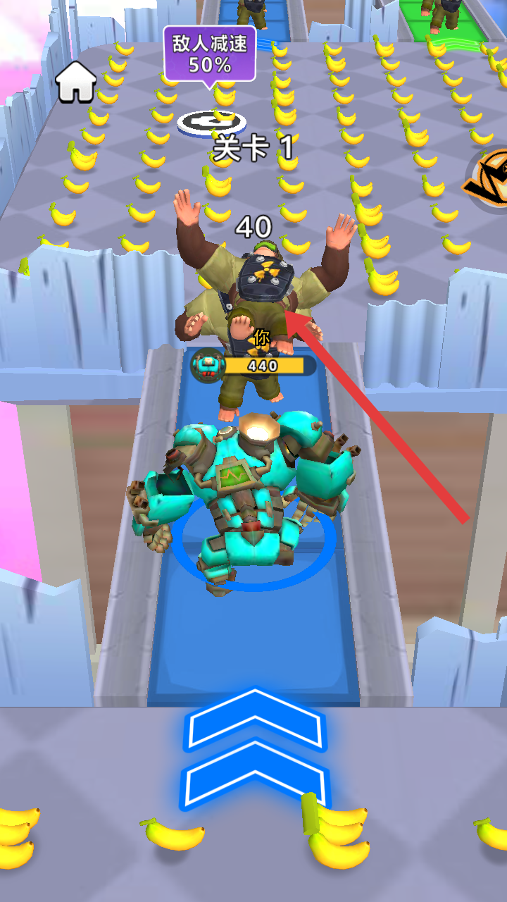 2、進(jìn)入戰(zhàn)斗后,吃更多的香蕉操控角色與敵人如持盾的敵人單位戰(zhàn)斗,利用角色能力攻擊敵人。
