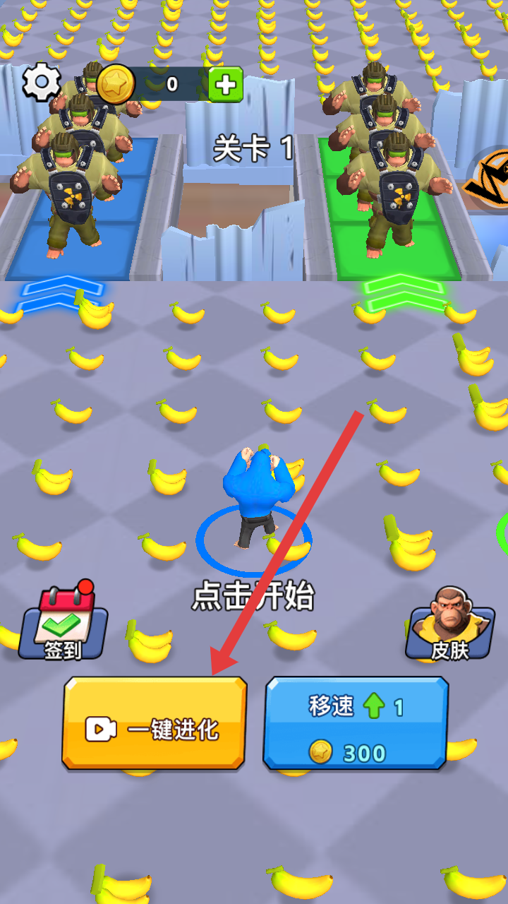 1、進(jìn)入游戲關(guān)卡1界面,可點(diǎn)擊一鍵進(jìn)化來提升角色,也能花費(fèi)金幣提升移速,之后點(diǎn)擊開始進(jìn)入戰(zhàn)斗。