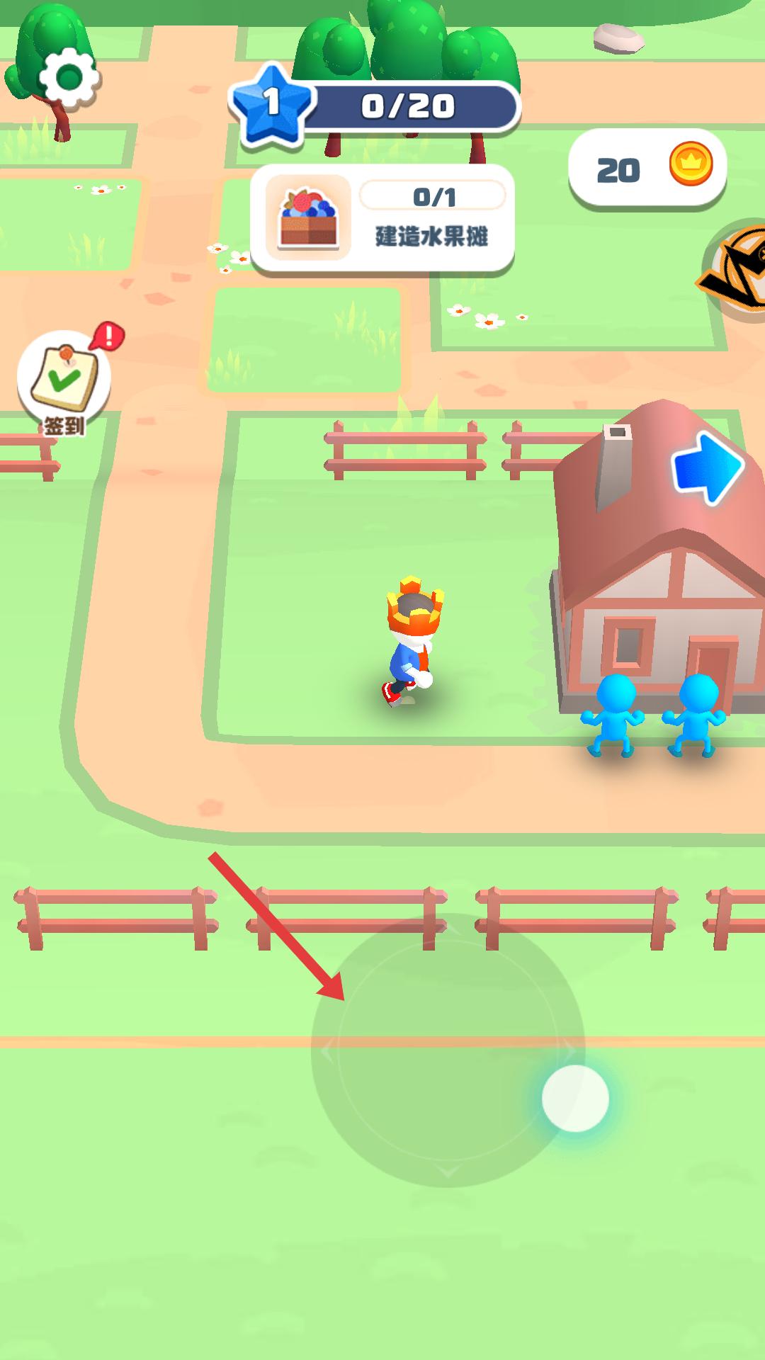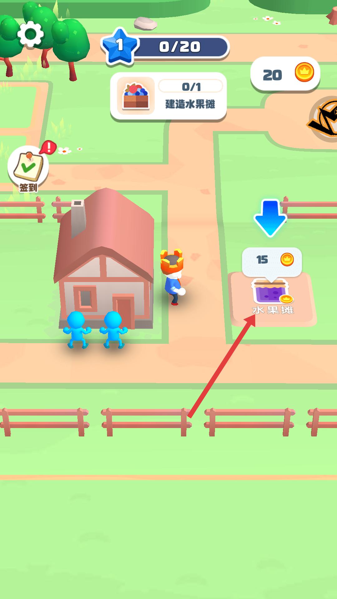 3、房子建造好后,界面提示建造水果攤,操控角色在場景中移動,尋找合適的建造位置,為后續(xù)建造水果攤做準備。