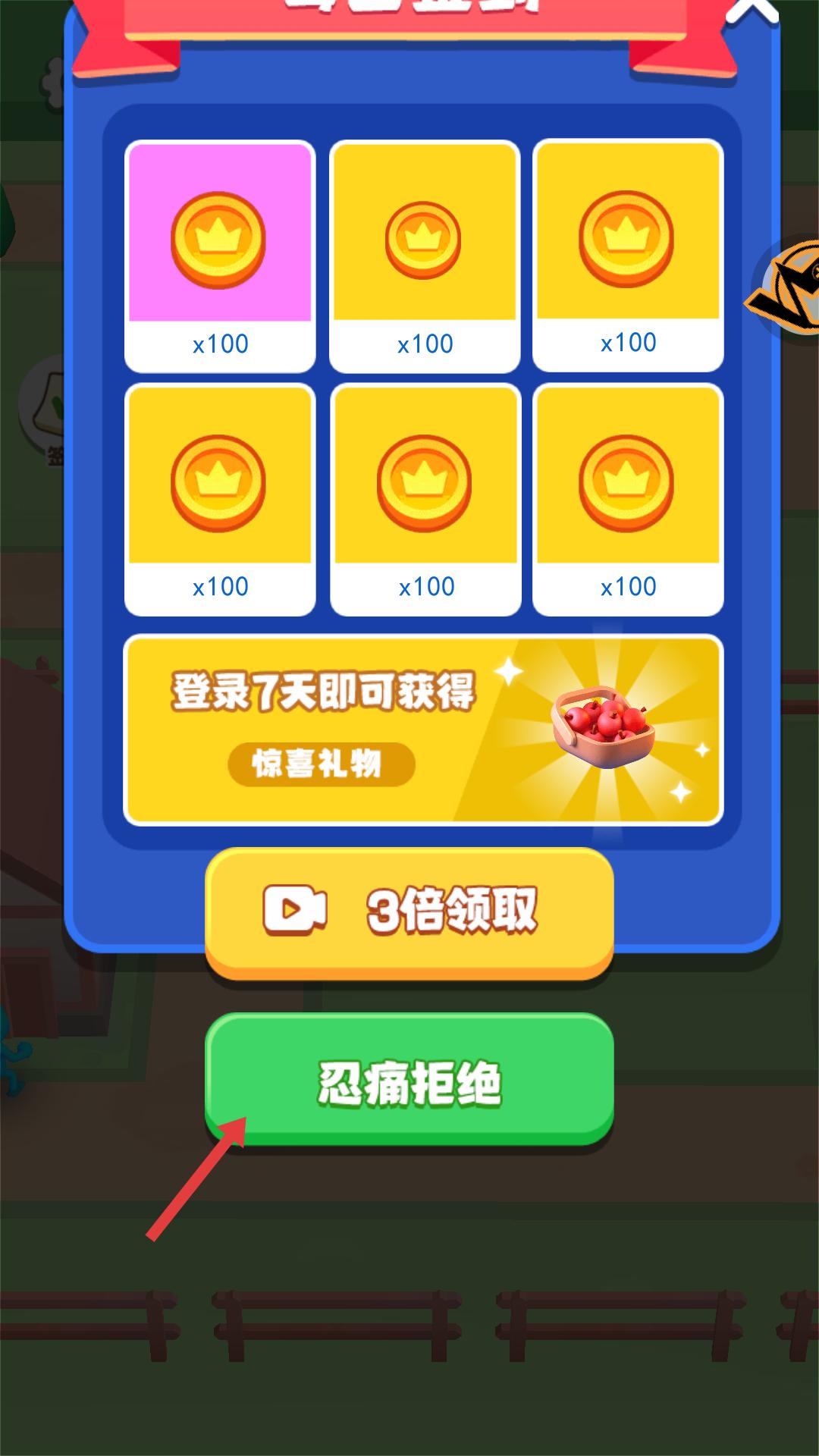 1、界面有金幣獎勵和登錄7天得驚喜禮物的提示,若不想看廣告領3倍獎勵,點擊忍痛拒絕按鈕,可關閉獎勵界面繼續(xù)游戲。