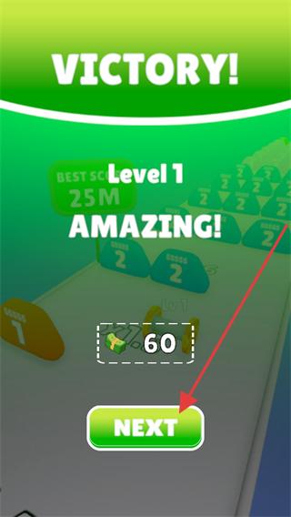 4、當成功到達終點完成關(guān)卡后,會出現(xiàn)VICTORY界面此時點擊NEXT按鈕,進入下一個關(guān)卡,繼續(xù)線軸跑酷收集挑戰(zhàn)。