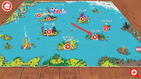 1、游戲有多個場景區(qū)域,像女巫之家、兔子花園等,點擊對應(yīng)區(qū)域的播放按鈕,就能進入該場景展開冒險。