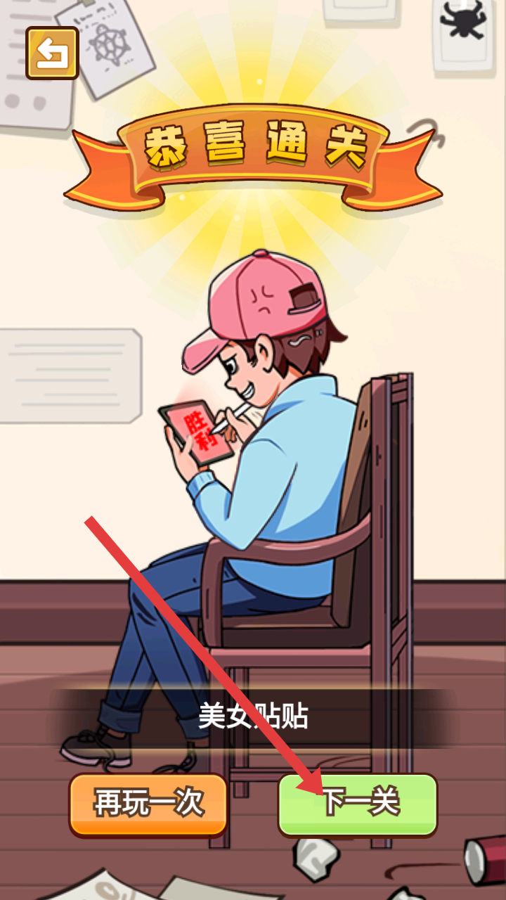 4、成功通關(guān)后,會(huì)顯示恭喜通關(guān)提示,可選擇再玩一次重新挑戰(zhàn),或點(diǎn)擊下一關(guān)繼續(xù)體驗(yàn)新關(guān)卡。