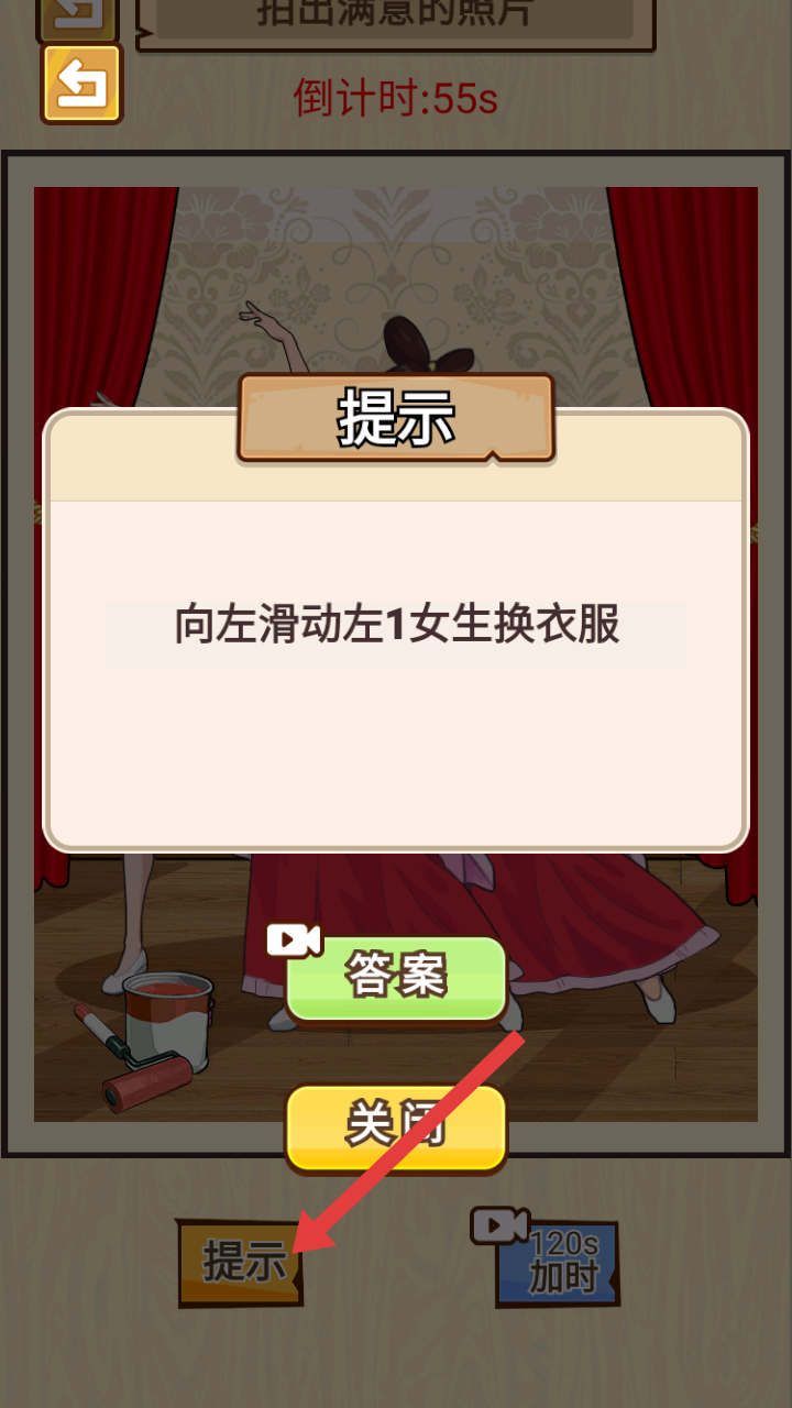 3、遇到困難時(shí),點(diǎn)擊提示按鈕,能獲取任務(wù)完成的線索,如向左滑動(dòng)左1女生換衣服,助力順利通關(guān)。
