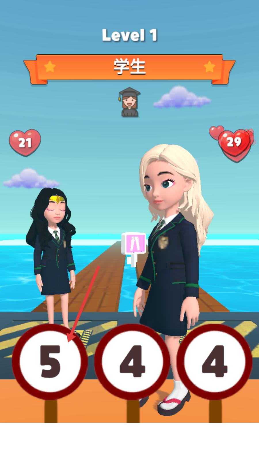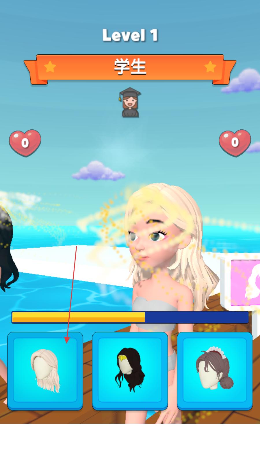 1、進(jìn)入變裝我最強(qiáng)游戲第一關(guān),看到有不同發(fā)型可供選擇,根據(jù)提示選合適發(fā)型,為角色裝扮。