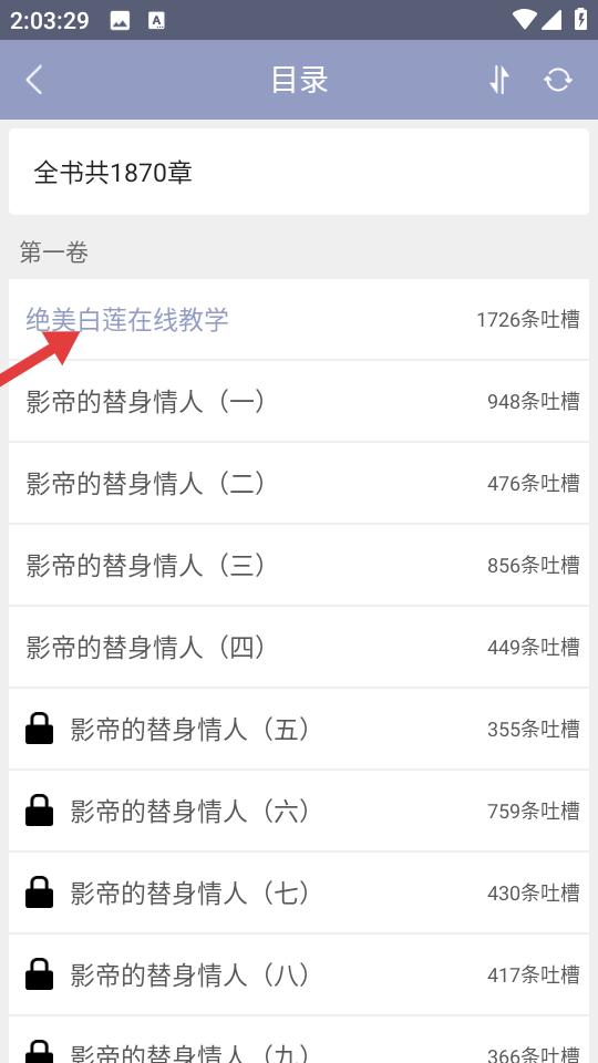3、書籍目錄頁清晰展示全書1870章架構(gòu),首卷絕美白蓮在線教學(xué)等章節(jié)列示,標(biāo)注吐槽數(shù)反映讀者互動,鎖章標(biāo)識提示閱讀進(jìn)度。