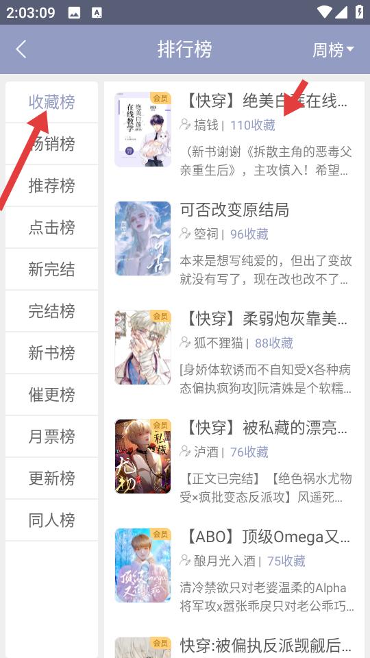 2、排行榜頁面左側(cè)羅列收藏榜、暢銷榜等多類榜單,右側(cè)展示快穿絕美白蓮在線等作品,標(biāo)注收藏數(shù)與劇情簡介。