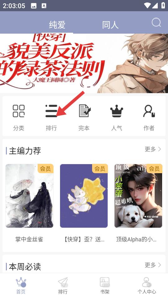 1、純愛頻道首頁頂部設(shè)分類、排行等功能入口,主編力薦與本周必讀板塊呈現(xiàn)優(yōu)質(zhì)作品,會員標(biāo)識清晰,方便用戶發(fā)現(xiàn)新書與熱門佳作。
