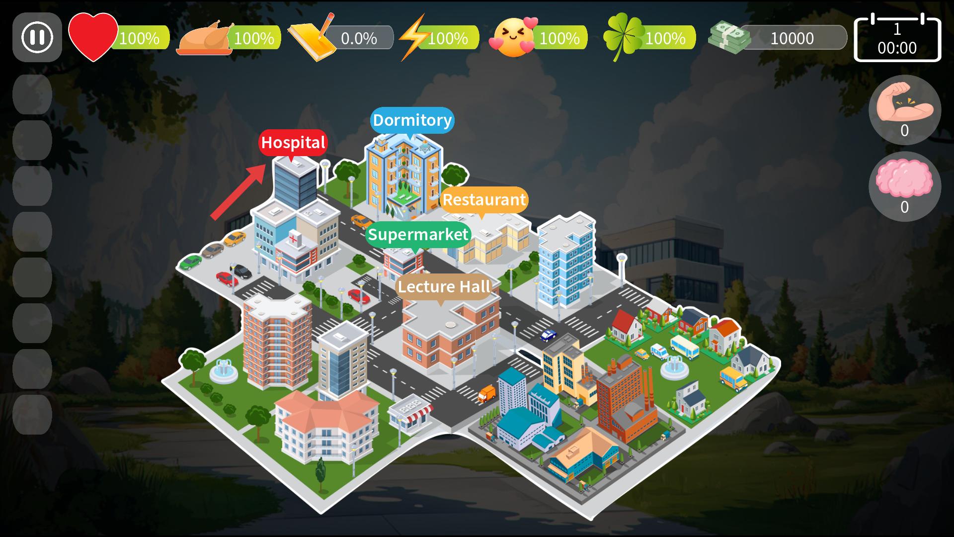 1、回合制生存決策:每天分配5個行動點在五個場景間移動,上課提升學術(shù)值但消耗精神,打工賺取資金卻增加饑餓度。合理安排行動順序是存活關(guān)鍵。