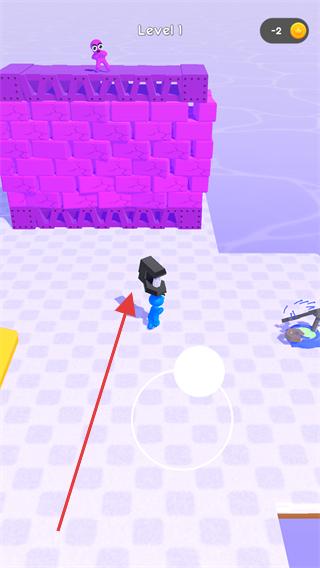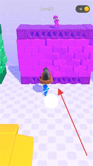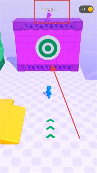 2、操控藍(lán)色小人朝著帶有靶心的紫色墻體前進(jìn),注意觀察墻體上方的紫色角色,保持移動(dòng)方向,逐步靠近墻體,準(zhǔn)備進(jìn)行投擲操作。
