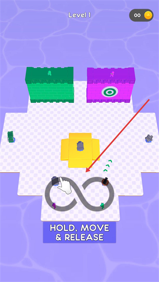 1、進(jìn)入游戲看到帶有Level1標(biāo)識(shí)的場(chǎng)景,按照提示進(jìn)行操作,通過按住移動(dòng)再釋放的方式,為后續(xù)行動(dòng)做準(zhǔn)備。