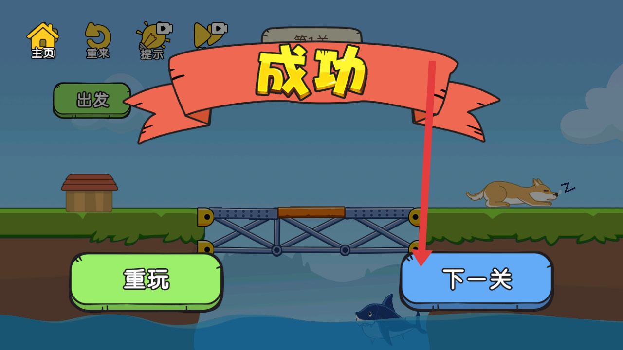 4、若小狗成功過河,會顯示成功,此時可點擊下一關(guān)繼續(xù)挑戰(zhàn),若想重新玩這一關(guān),也可點擊重玩。