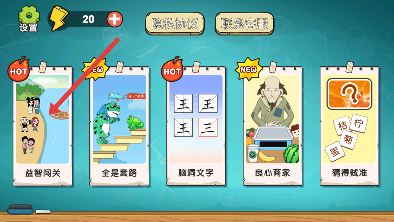 1、進入游戲,模式選擇界面點擊益智闖關(guān),然后選擇益智闖關(guān)的關(guān)卡準(zhǔn)備開始游戲。