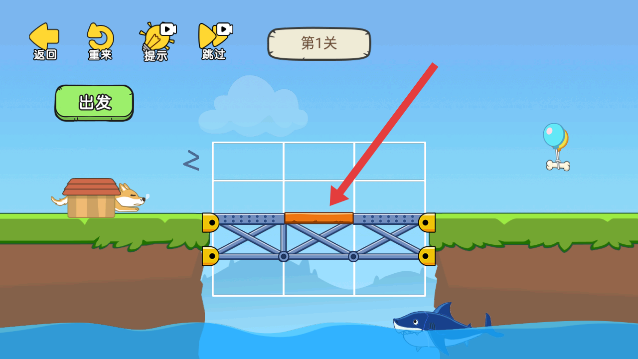 3、根據(jù)提示或自己的思路,將橋梁組件放置到合適位置,搭建好橋梁后,點擊出發(fā)按鈕,讓小狗嘗試過河。