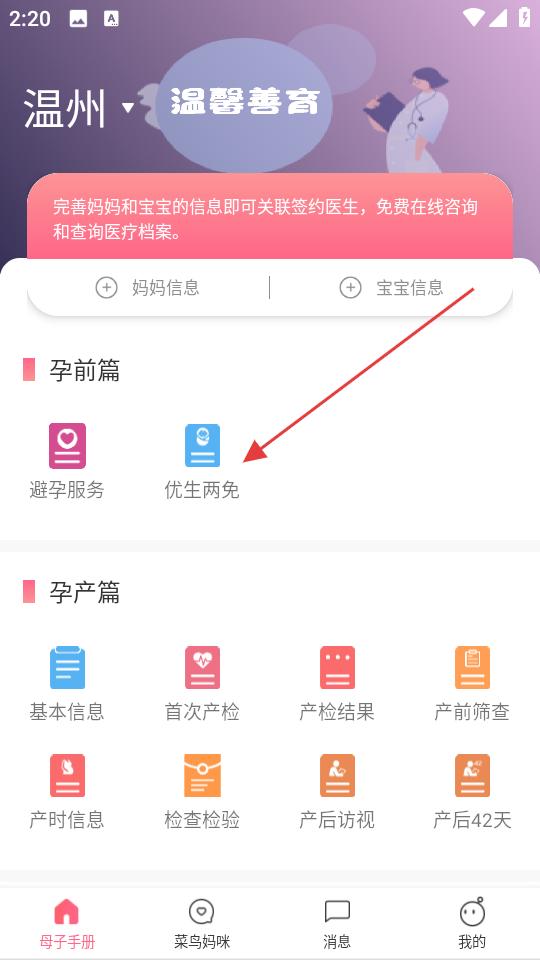 1、母子手冊頁面,分孕前、孕產(chǎn)篇,孕前有避孕、優(yōu)生服務(wù),孕產(chǎn)含基本信息、產(chǎn)檢等多項功能,完善信息可關(guān)聯(lián)醫(yī)生。