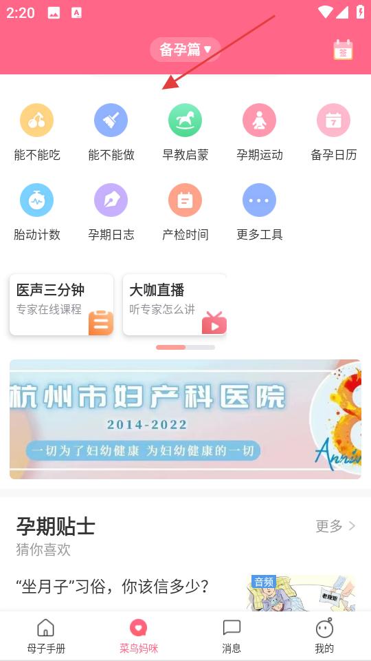 2、菜鳥媽咪備孕篇,有能不能吃等工具,還有醫(yī)聲課程、大咖直播,及孕期貼士,助力備孕知識學(xué)習(xí)。