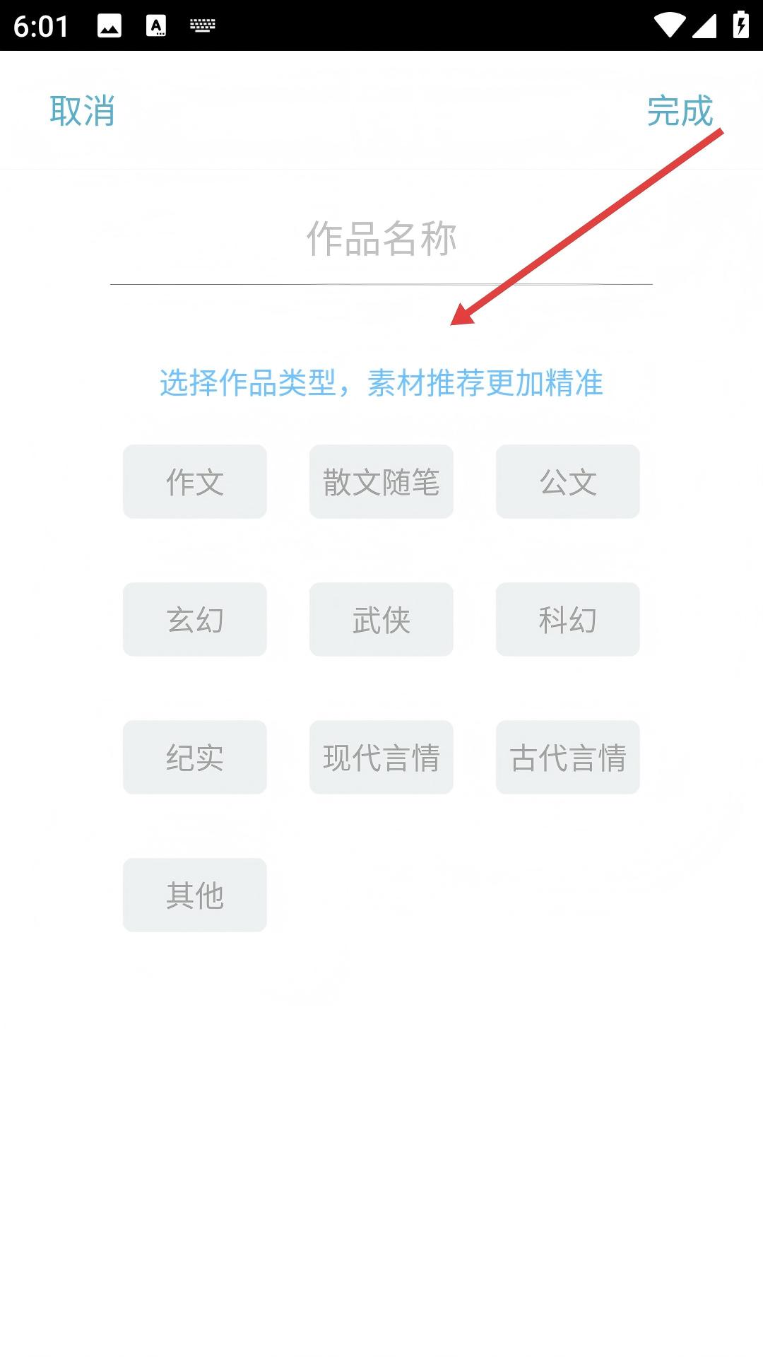 2、創(chuàng)建作品時,需填寫作品名稱,選擇作品類型,有作文、散文隨筆、公文、玄幻等多種類型可選,選擇后素材推薦更精準(zhǔn),最后點(diǎn)擊完成即可。