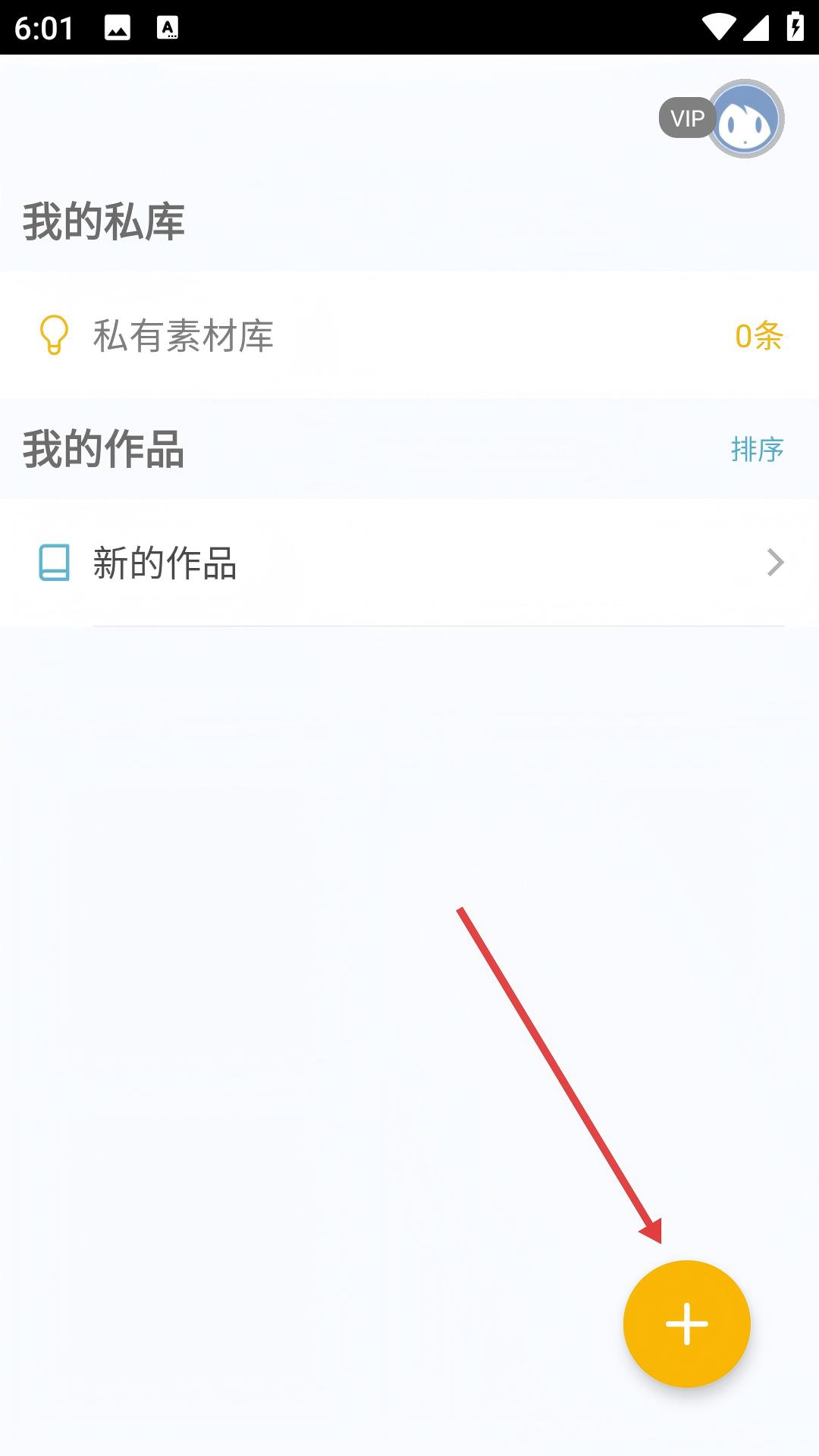 1、該軟件界面有我的私庫、我的作品板塊,私有素材庫初始0條,可點(diǎn)擊右下角加號按鈕,進(jìn)行作品創(chuàng)建或素材添加操作。