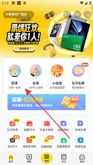 1、進(jìn)入首頁(yè)可看到團(tuán)課、私教等課程入口,點(diǎn)擊團(tuán)課按鈕,進(jìn)入團(tuán)課列表頁(yè)面。
