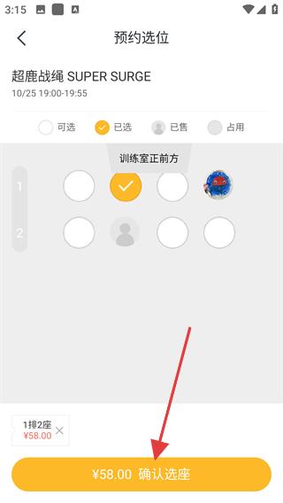 4、在預(yù)約選位頁(yè)面選擇訓(xùn)練室的座位,點(diǎn)擊確認(rèn)選座按鈕,完成團(tuán)課預(yù)約,后續(xù)可按時(shí)參加課程,享受專(zhuān)業(yè)的健身指導(dǎo)。
