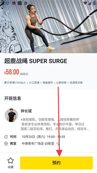 2、在團(tuán)課列表頁(yè)面選擇超鹿戰(zhàn)繩SUPERSURGE課程,點(diǎn)擊預(yù)約按鈕,進(jìn)入課程詳情頁(yè)面。