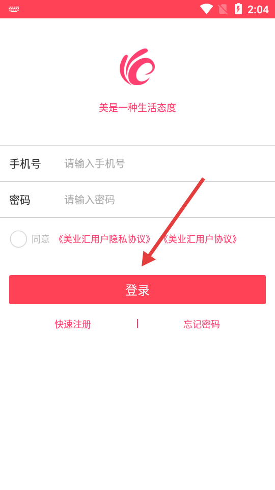 1、點擊登錄界面,粉色風格,展示品牌標語,用戶需填手機號、密碼,勾選協(xié)議后登錄,另有注冊和找回密碼功能。