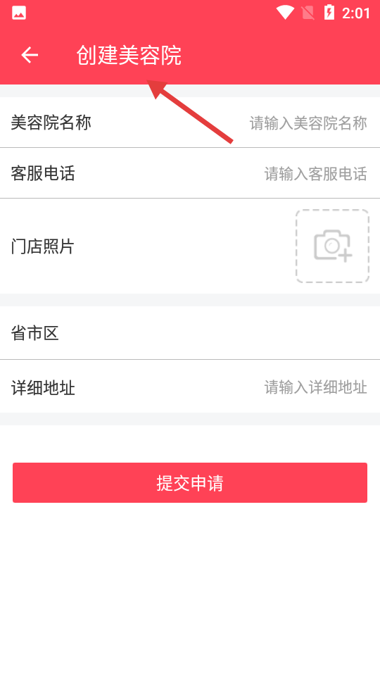 3、點擊創(chuàng)建美容院頁面,供店老板錄入名稱、電話、地址等信息,上傳門店照片,一鍵提交申請,流程簡潔明了。