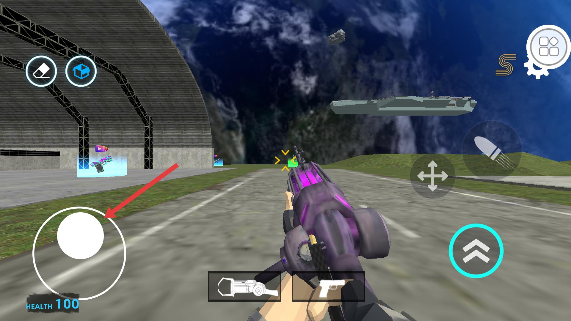 2、進入游戲后,通過左側(cè)的移動控制按鈕,操控角色在太空場景中移動,同時可切換武器,準備應(yīng)對可能出現(xiàn)的情況。