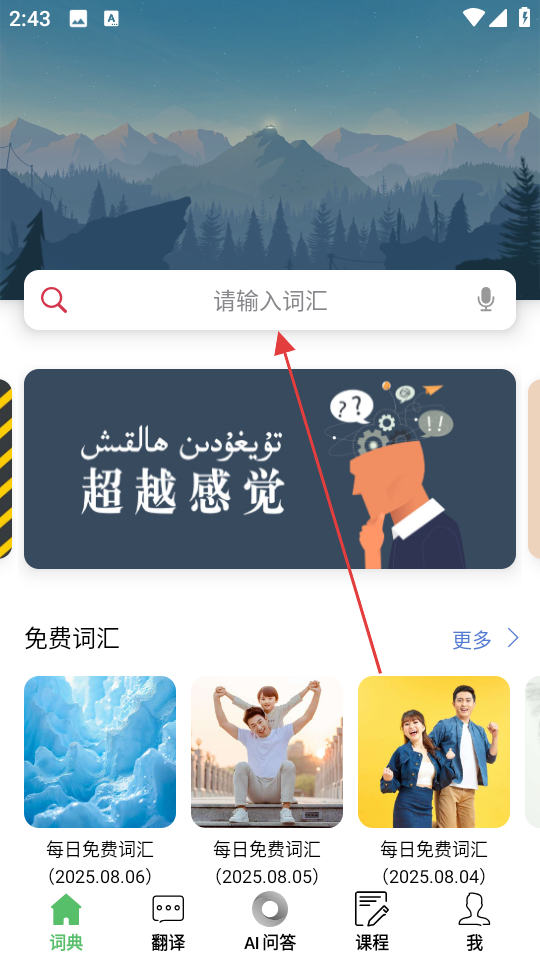 1、進(jìn)入詞典頁(yè)面,找到頂部搜索框,點(diǎn)擊激活,輸入需查詢的詞匯,系統(tǒng)自動(dòng)匹配,呈現(xiàn)詞匯釋義、用法示例,輔助語(yǔ)言學(xué)習(xí)。