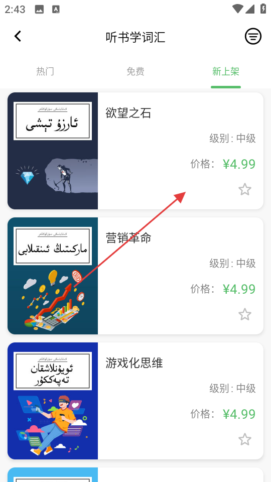 3、進(jìn)入聽書學(xué)詞匯頁(yè)面,瀏覽新上架書籍列表,查看書籍標(biāo)題、級(jí)別、價(jià)格,挑選感興趣內(nèi)容,點(diǎn)擊進(jìn)入詳情,開啟聽書模式積累詞匯。