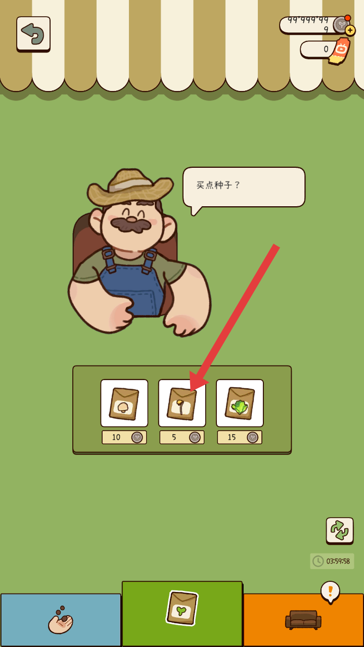 3、若種子不足,可到種子商店,有戴草帽的角色詢問是否買點(diǎn)種子,選擇心儀的種子用硬幣購買,補(bǔ)充種子資源。