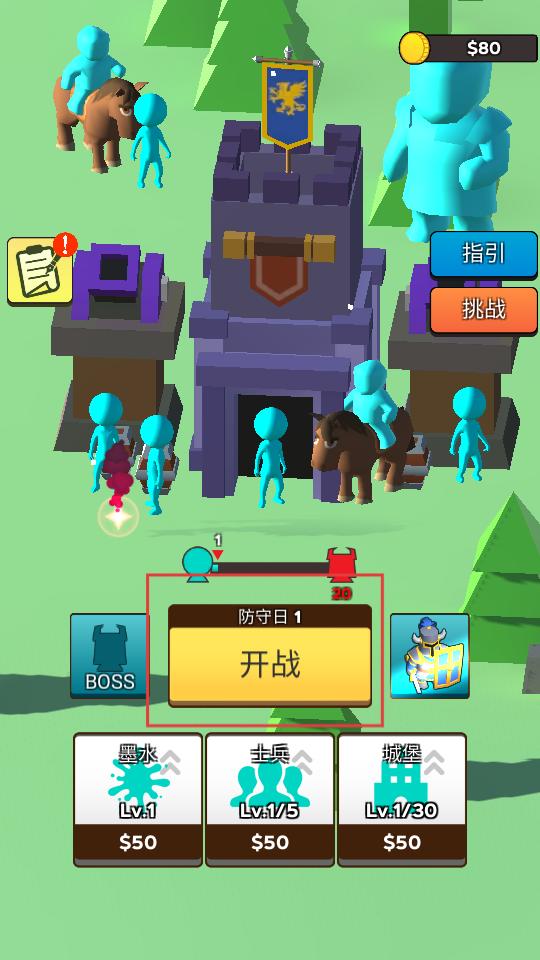 1、進入游戲,能看到城堡等場景,下方有墨水、士兵、城堡等升級選項,花費對應金幣可提升,為戰(zhàn)斗做準備,然后點擊開戰(zhàn),開啟防守日戰(zhàn)斗。
