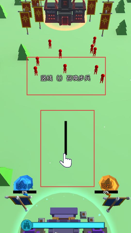 2、戰(zhàn)斗時根據提示,用手指畫豎線,就能召喚步兵,這些步兵會前往戰(zhàn)場,和敵人展開對抗,同時還能關注龍卷風、隕石等技能的蓄力情況。