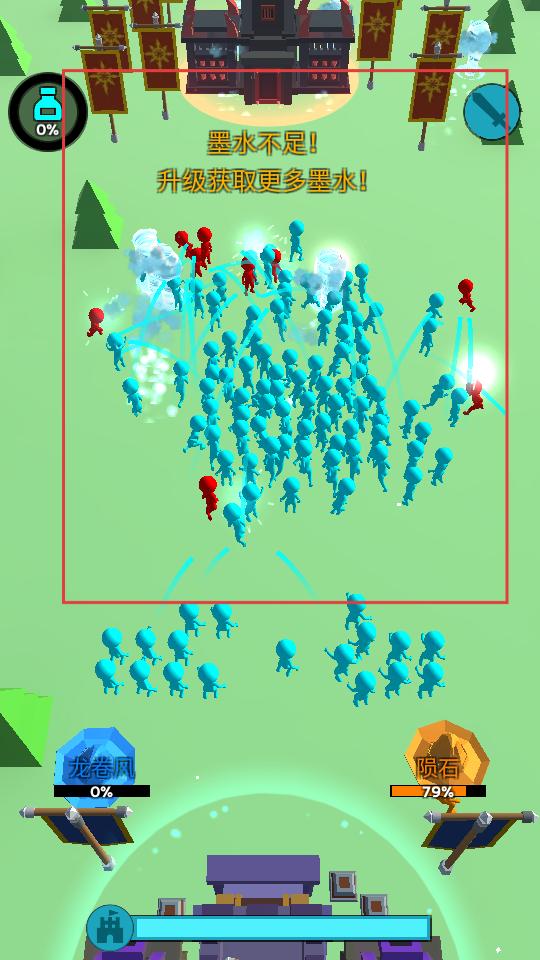 3、戰(zhàn)斗中藍色士兵與紅色敵人交鋒,若墨水不足,會提示升級獲取更多墨水,此時可合理運用已有的士兵和技能,盡可能擊敗更多敵人。