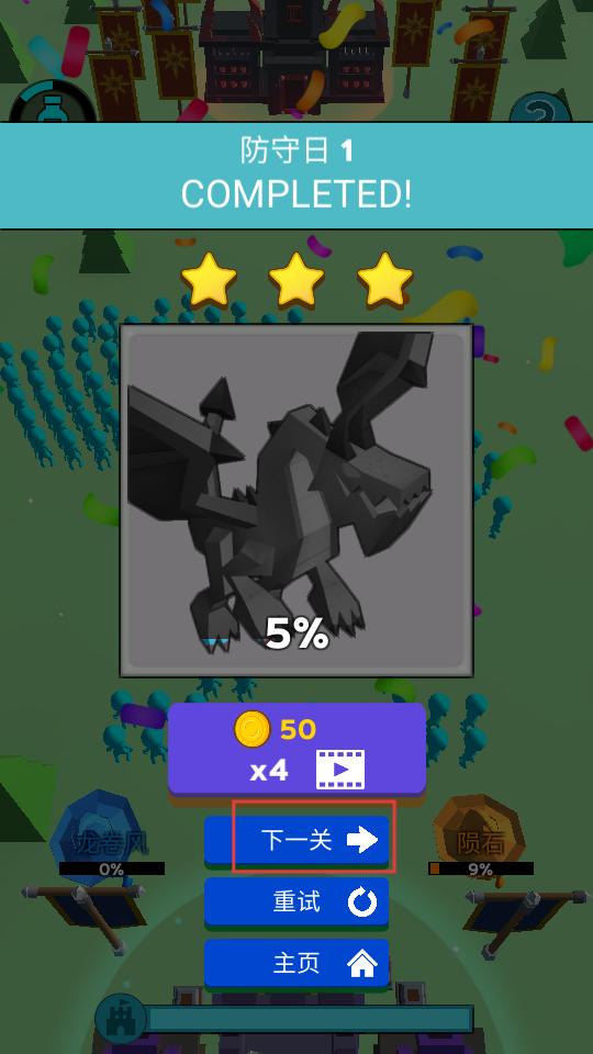 4、成功完成防守日戰(zhàn)斗后,會顯示COMPLETED并給出星級評價,還能獲得金幣等獎勵,之后可點擊下一關繼續(xù)挑戰(zhàn),也能選擇重試或返回主頁。