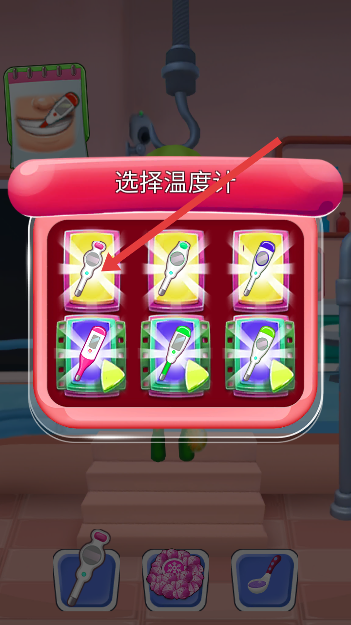 2、診療環(huán)節(jié),會彈出選擇溫度計的界面,有多種樣式的溫度計可供挑選,選好后就能給水果患者測量體溫。