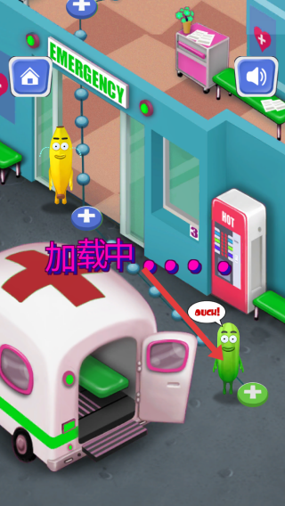 1、游戲開始會進(jìn)入醫(yī)院急診場景,有救護(hù)車和受傷的水果角色,等待加載完成后,可開始對水果患者進(jìn)行救治。