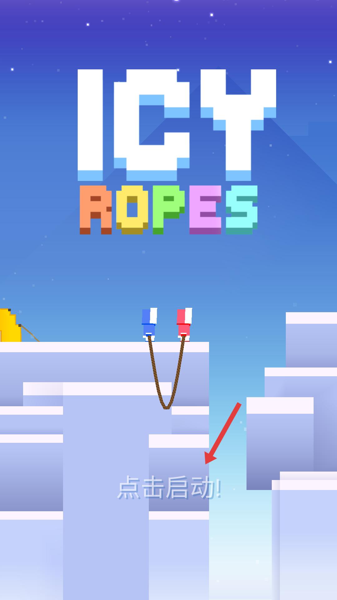 1、游戲主界面有點擊啟動提示,點擊后可進入游戲,操控角色利用繩索在冰雪場景中移動,開啟冒險之旅。
